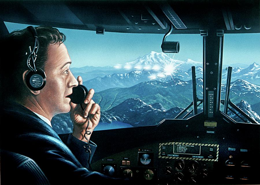 1947年6月24日,有一个美国企业家开着私人飞机跨越华盛顿雷尼尔山时,看见空中飞着九个白色的碟状飞行物。