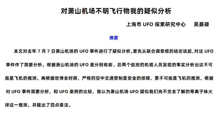 萧山UFO事件发生的一年后,上海市UFO探索研究中心的吴嘉禄老师在经过一年的细致研究后,发表了一篇分析报告。