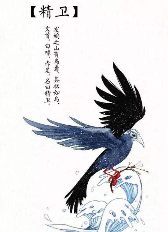 再往北二百里,是发鸠山。山上生长着茂密的柘树林。山中栖息着一种禽鸟,其形状像普通的乌鸦,但头部的羽毛上有花纹,还长着白色的嘴巴、红色的足爪,名字就叫精卫,它发出的叫声就是自己的名字,精卫鸟原是炎帝的小女儿,名叫女娃。她到东海游玩,不慎淹死在东海里,死后她的灵魂就变成了精卫鸟。她悲愤自己年轻的生命被葬送海底,因此常常衔了西山的树枝石子,投到东海里去,想把大海填平。传说现在的山东半岛和辽东半岛,就是精卫填成的。后来民间传说这种鸟就住在海边,和海燕结成配偶,生下的孩子,雌的像精卫,雄的像海燕。至今东海还有精卫誓水的地方,因为曾经淹死在那里,就发誓不再喝那里的水,所以,精卫又称为誓鸟、信鸟,古人认为它是一种有志气的禽鸟,并把它当作追求理想和毅力的化身。