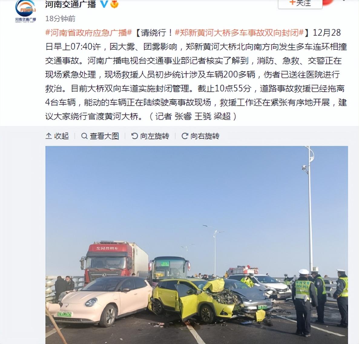 据河南交通广播最新消息,消防、急救、交警正在现场紧急处理,现场救援人员初步统计涉及车辆200多辆,伤者已送往医院进行救治。目前大桥双向车道实施封闭管理。截止10点55分,道路事故救援已经拖离4台车辆,能动的车辆正在陆续驶离事故现场,救援工作还在紧张有序地开展。