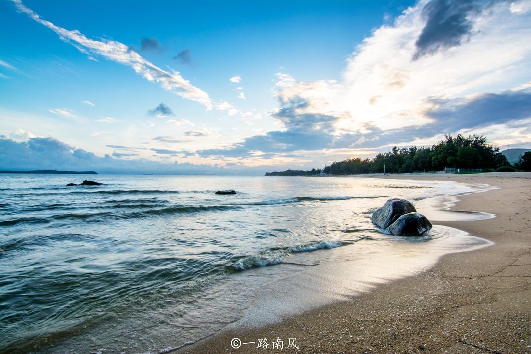 这里拥有金黄色的海滩,在太阳光的照耀下闪烁着耀眼的光芒,虽然因为方位的原因无法看到落日,但夕阳的余晖照耀在海面上泛起淡黄色的光芒,特别好看。