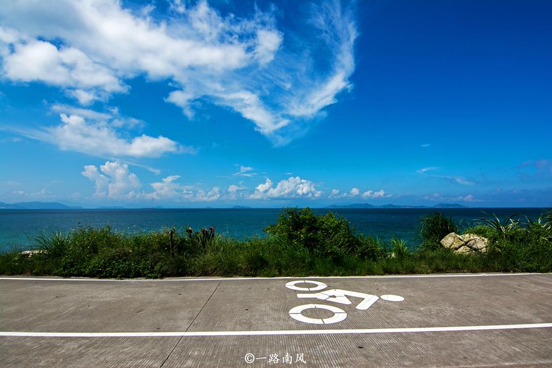 从海边的村落出发,发现环海公路修得很好,公路的一侧修有单车骑行道,方便游客骑行游览。