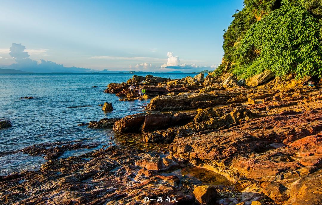 杨梅坑最美的风光在鹿嘴,鹿嘴包括鹿嘴湾、鹿鸣山庄和高山角,这里没有海水浴场,只有断崖和形态各异的黑礁石,是傍晚欣赏日落的好地方。