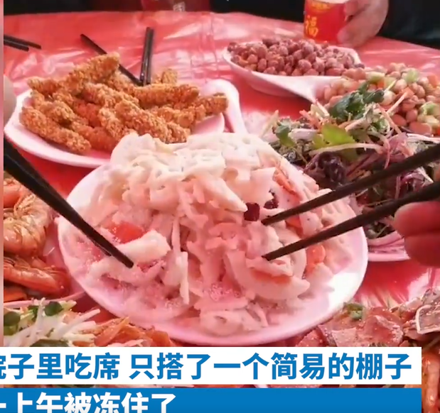 从视频中能看到,一盘凉拌的莲藕已被冻成了“冰雕”,莲藕上面还有一层冰霜,众人用筷子夹不动、扒拉几下也没弄开。其它几个菜也是如此,都冻得硬梆梆的。无从下嘴,大家都在那里笑,后来菜都被大家打包带走了。